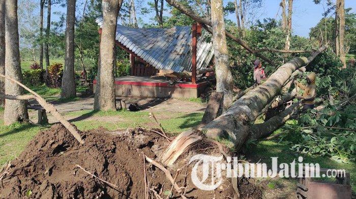 Pohon karet roboh menimpa gazebo Wisata Sumber Bon C Blitar saat hujan es disertai angin kencang, pengunjung yang berteduh dievakuasi.