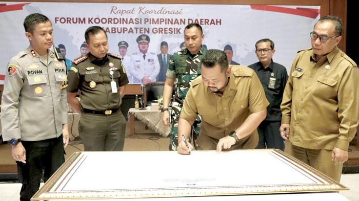 Bupati Gresik, Fandi Akhmad Yani bersama Forkopimda menggelar deklarasi untuk penertiban jam operasional kendaraan berat di Kabupaten Gresik.