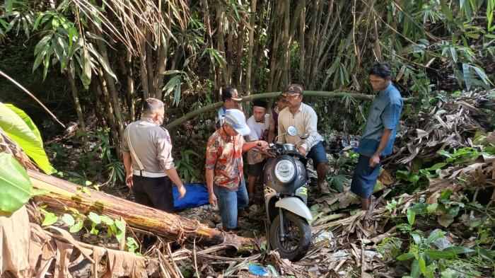 Tak jauh dari lokasi penemuan, sebuah sepeda motor Honda Scoopy bernomor polisi L-2419-CAM warna hitam, yang diduga milik korban, turut ditemukan.