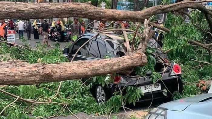 - Pohon tumbang menimpa sejumlah kendaraan jemaah pengajian yang diparkir di sekitar Alun-alun Sidoarjo.