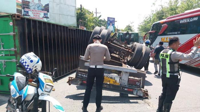Truk Kontainer Muat Kayu Lapis Terguling di Jombang, Arus Lalin Macet Total Sampai 2 Jam