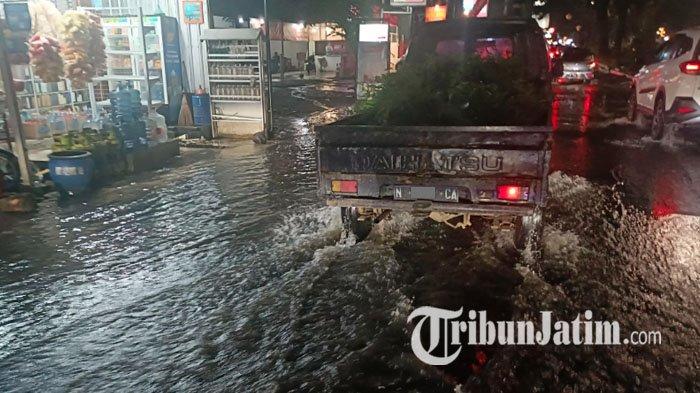Diguyur hujan deras, Jalan Suhat Malang tergenang air, banyak kendaraan yang memilih mengurangi kecepatan saat melintas. Kondisi jalan rusak.