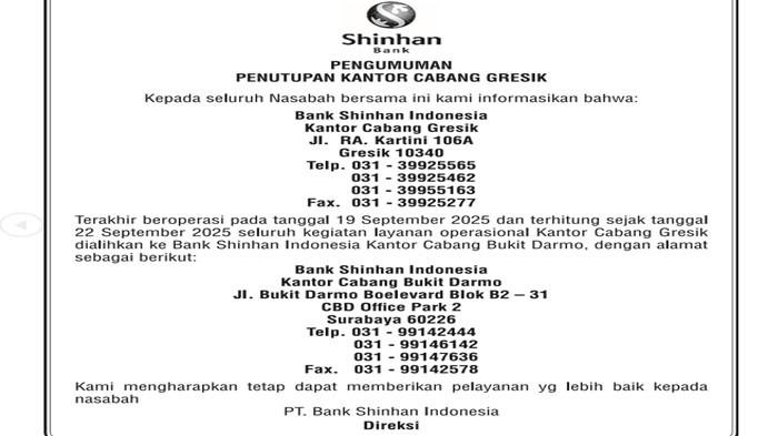 Bank Shinhan Indonesia telah mengumumkan bahwa Kantor Cabang Gresik akan resmi menutup operasionalnya pada tanggal 19 September 2025