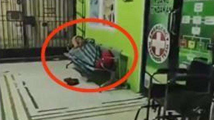 Seorang pria terbaring lemah di kursi tunggu Puskesmas karena tidak ada petugas yang datang melayani.
