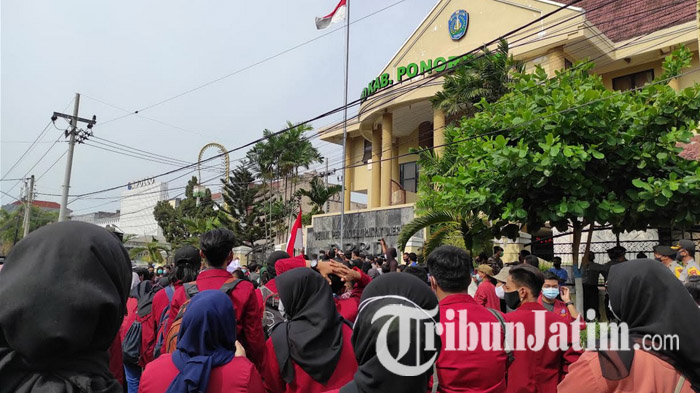 Mahasiswa Universitas Muhammadiyah Ponorogo menggeruduk Gedung DPRD Ponorogo untuk menuntut UU Omnibus Law Cipta Kerja dicabut.