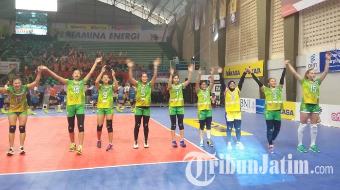 Pada pertandingan terakhir Proliga Bola Voli 2017 seri kedua putaran kedua di GOR Kertajaya Surabaya, Minggu (12/3/2017) malam, Tim putri Gresik...